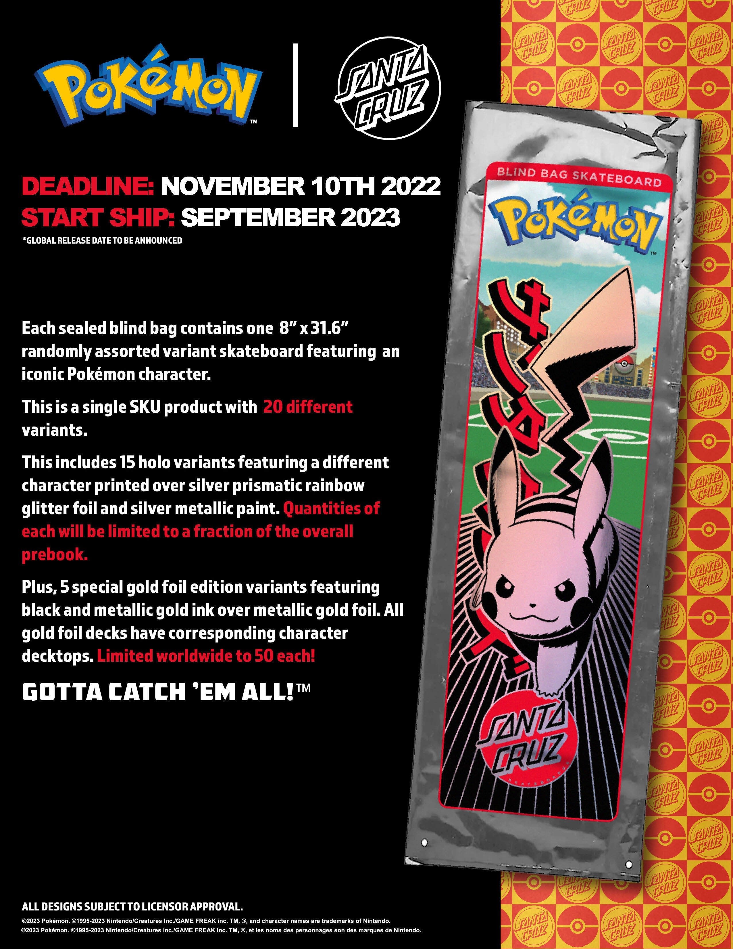Chaque sac aveugle scellé contient une variante de deck assortie au hasard de 8 "x 31,6" avec un personnage Pokémon emblématique.